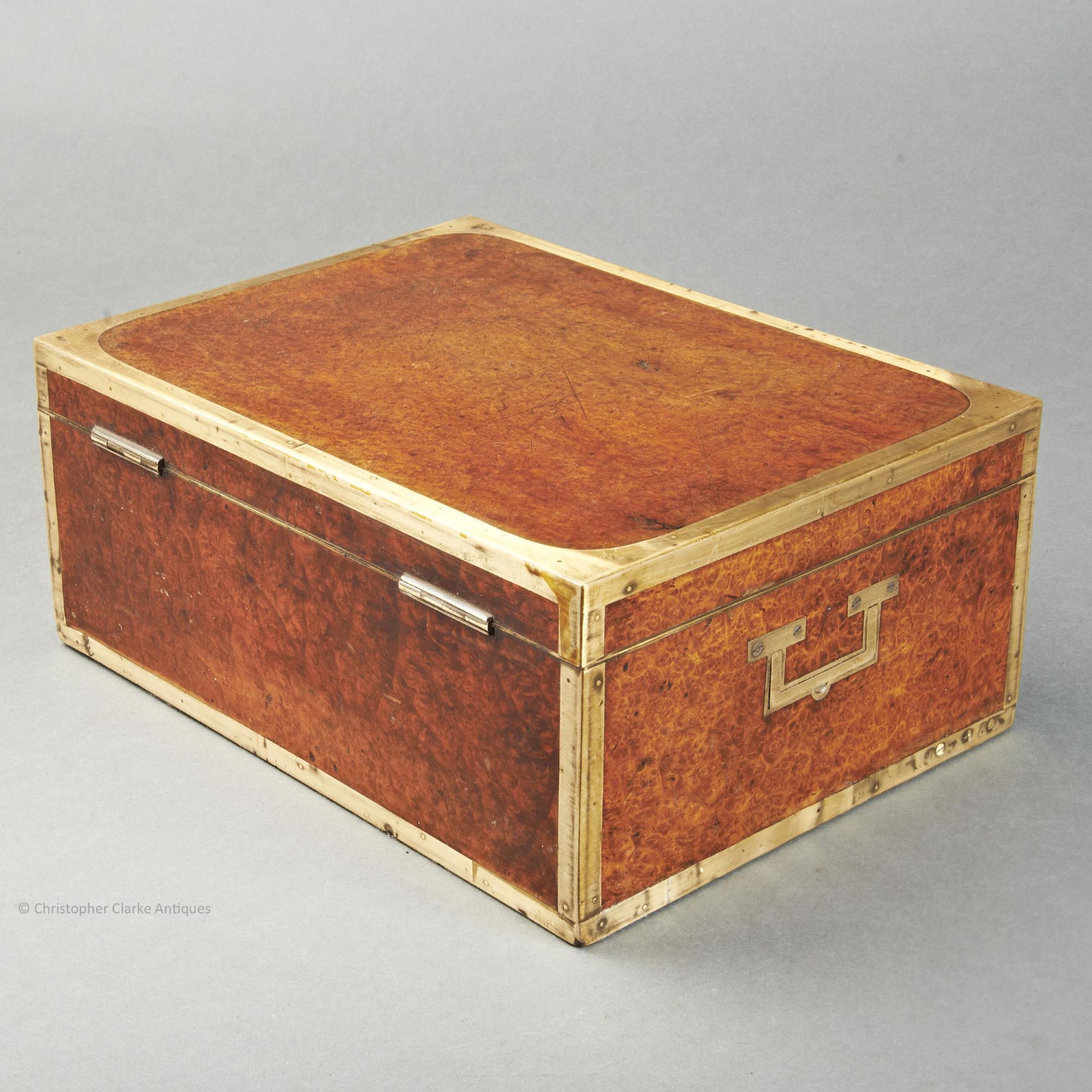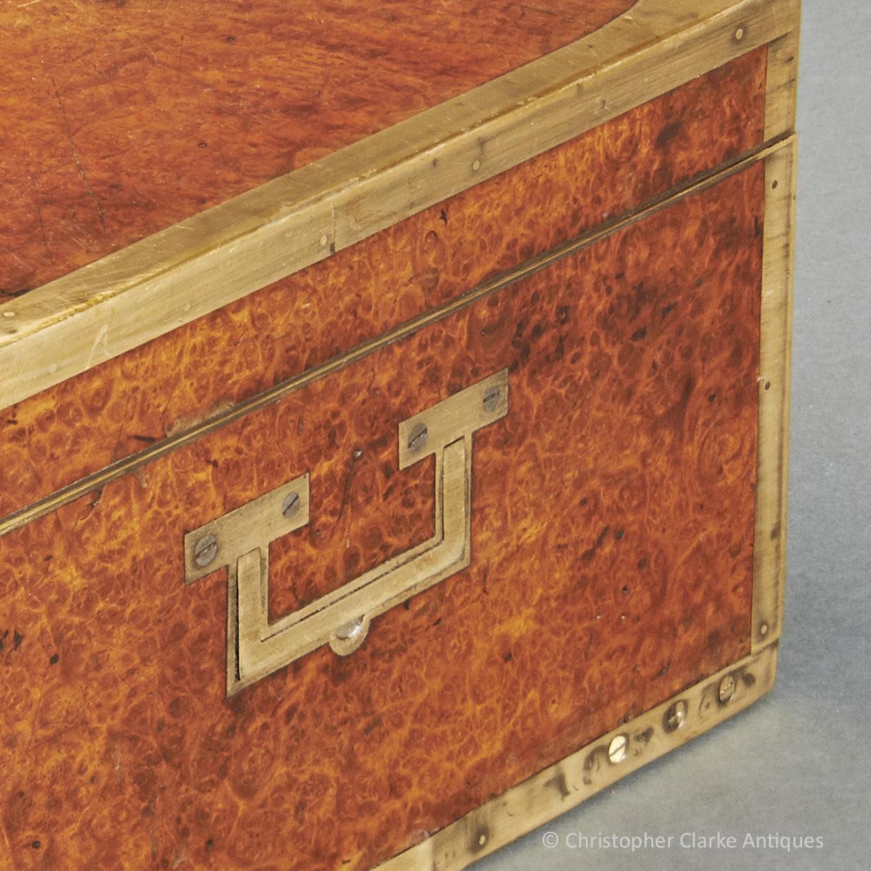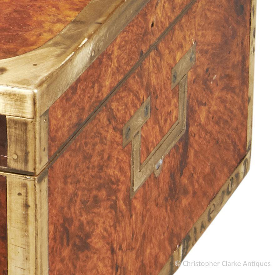 The rich colour and figuring of the amboyna is offset by brass edging to all sides of the box, as is fairly typical of such Dressing Cases. The sides have flush brass skeletal campaign handles.
