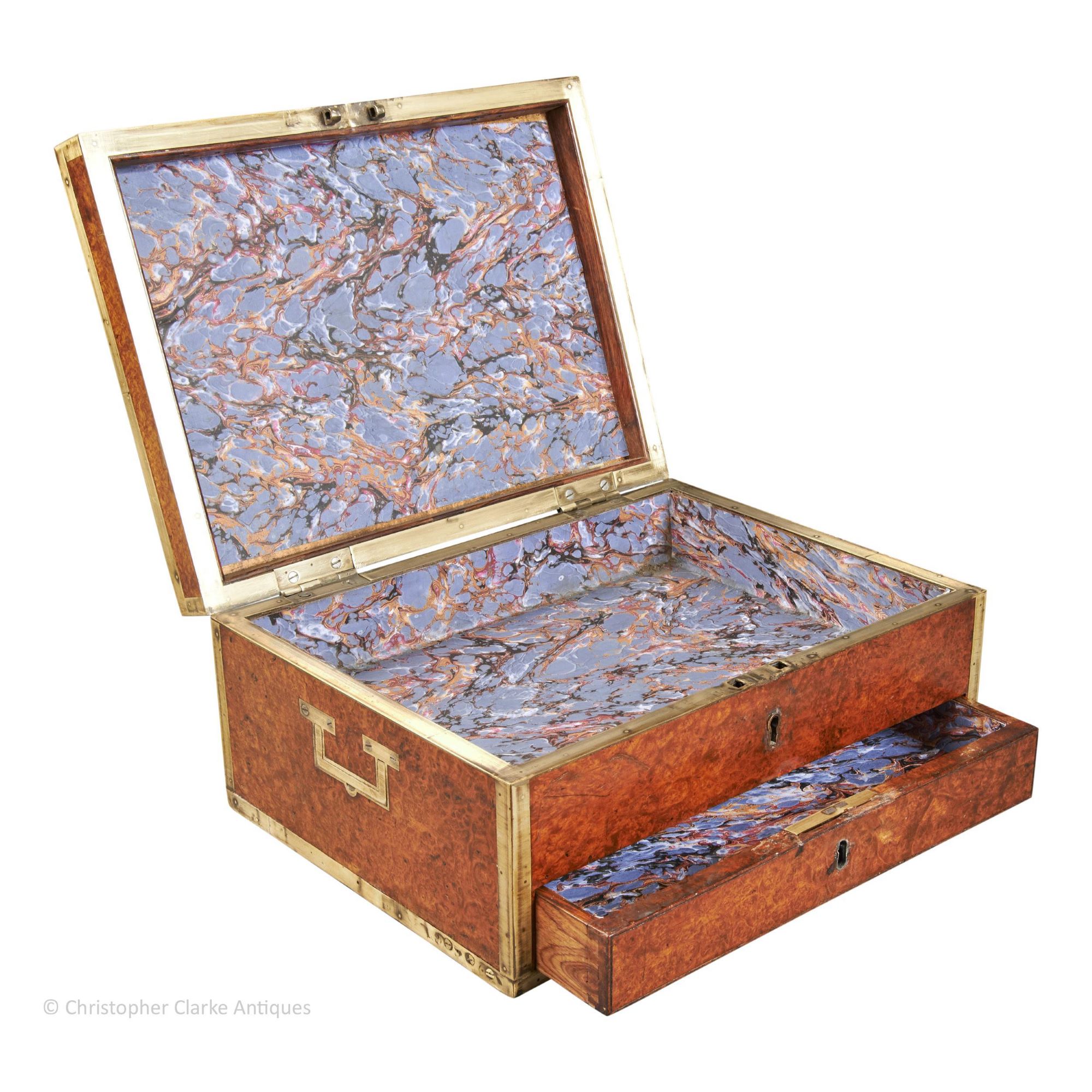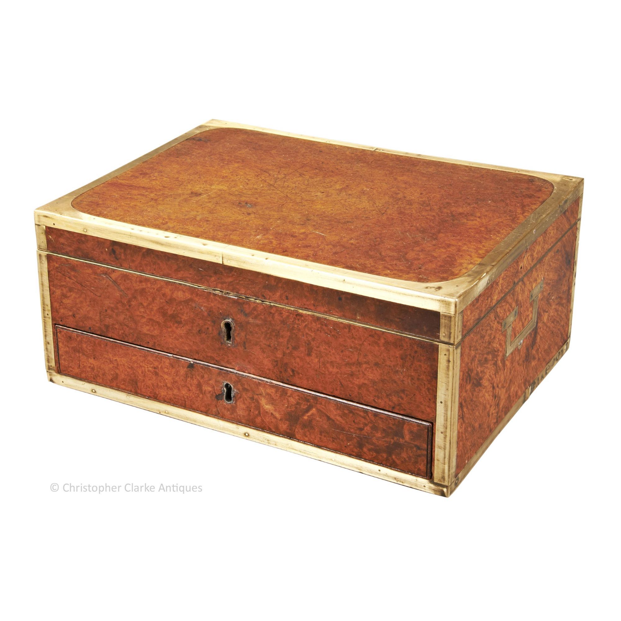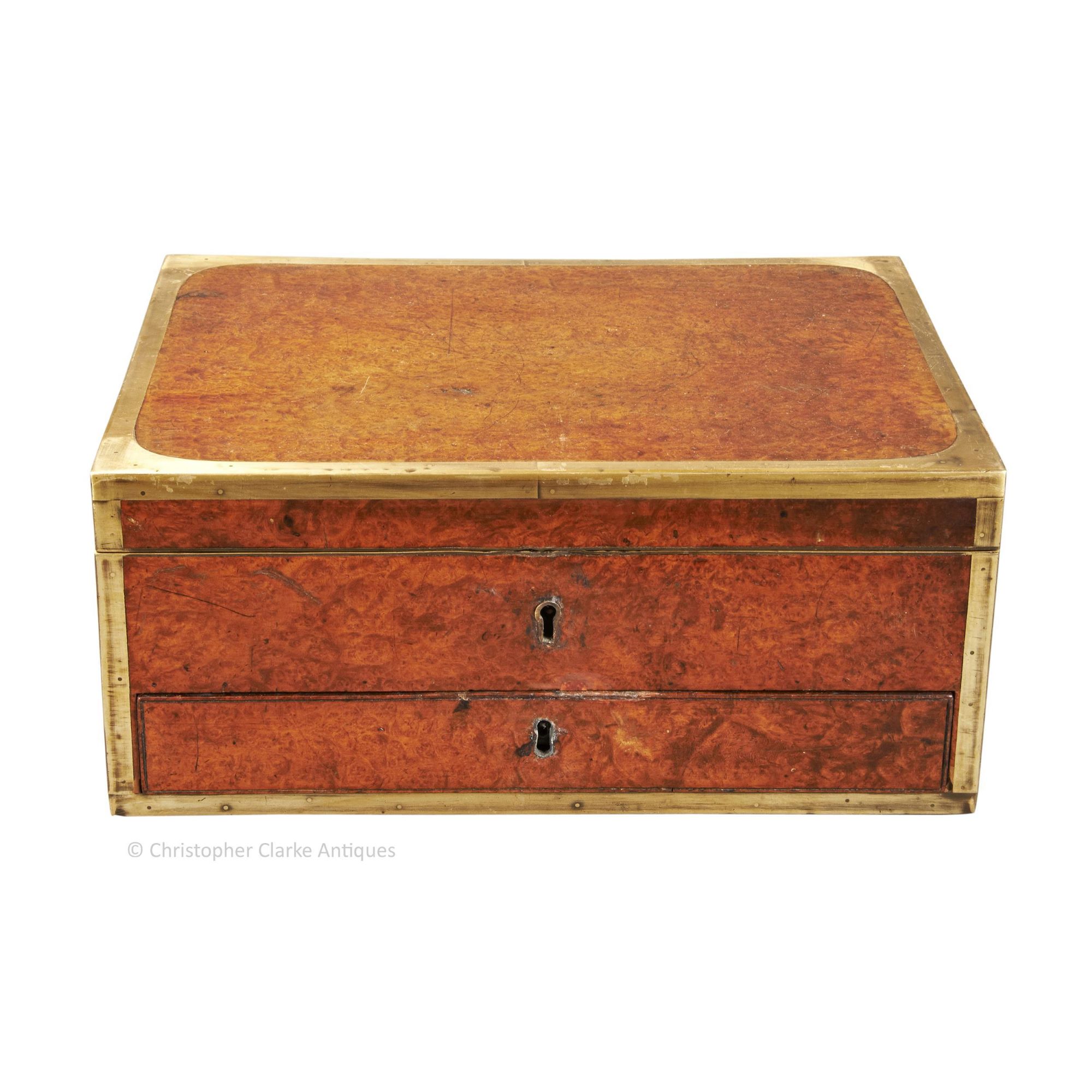 The rich colour and figuring of the amboyna is offset by brass edging to all sides of the box, as is fairly typical of such Dressing Cases. The sides have flush brass skeletal campaign handles.