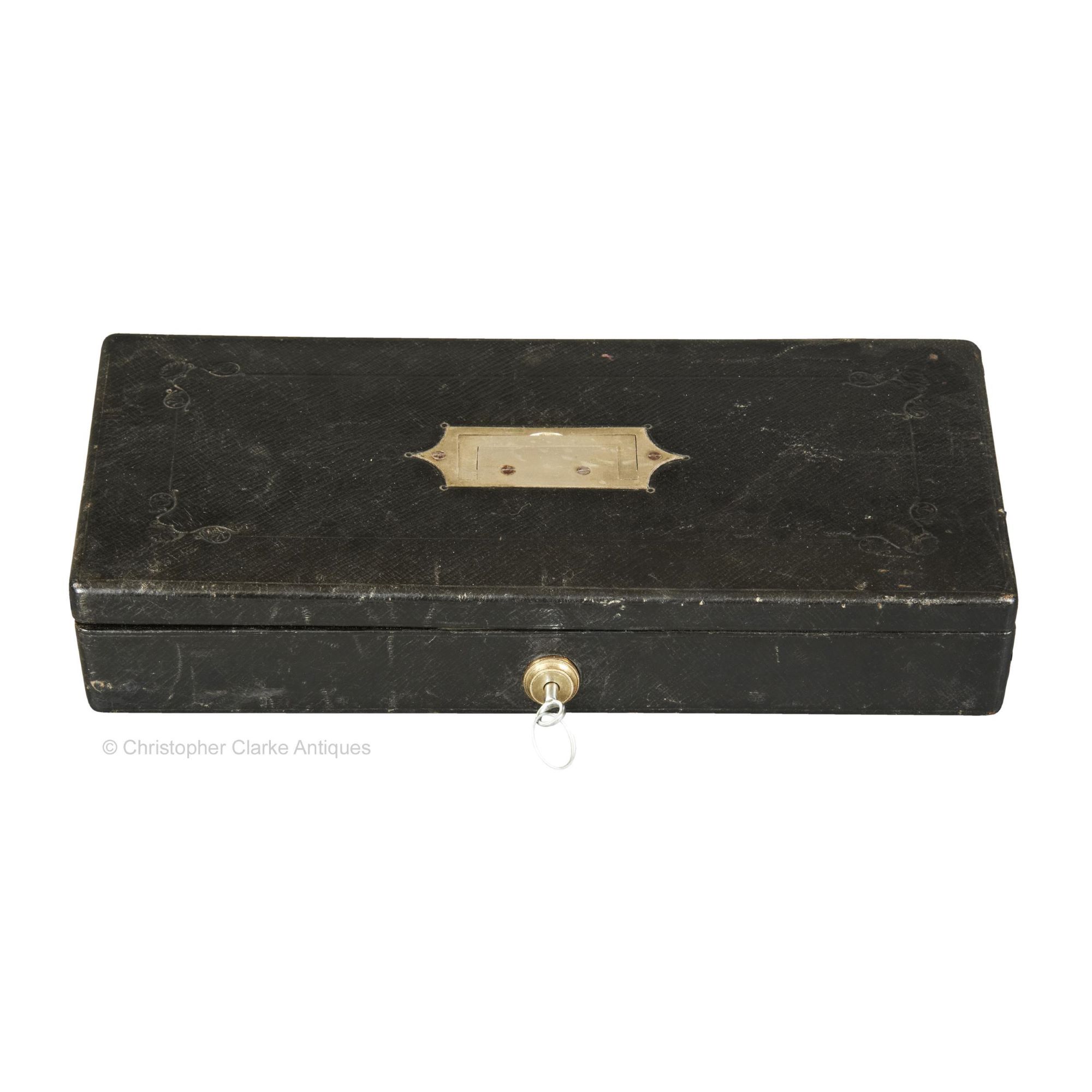 The top has blind tooling to offer some subtle decoration. The key for the Bramah lock has been replaced to make the box useable.