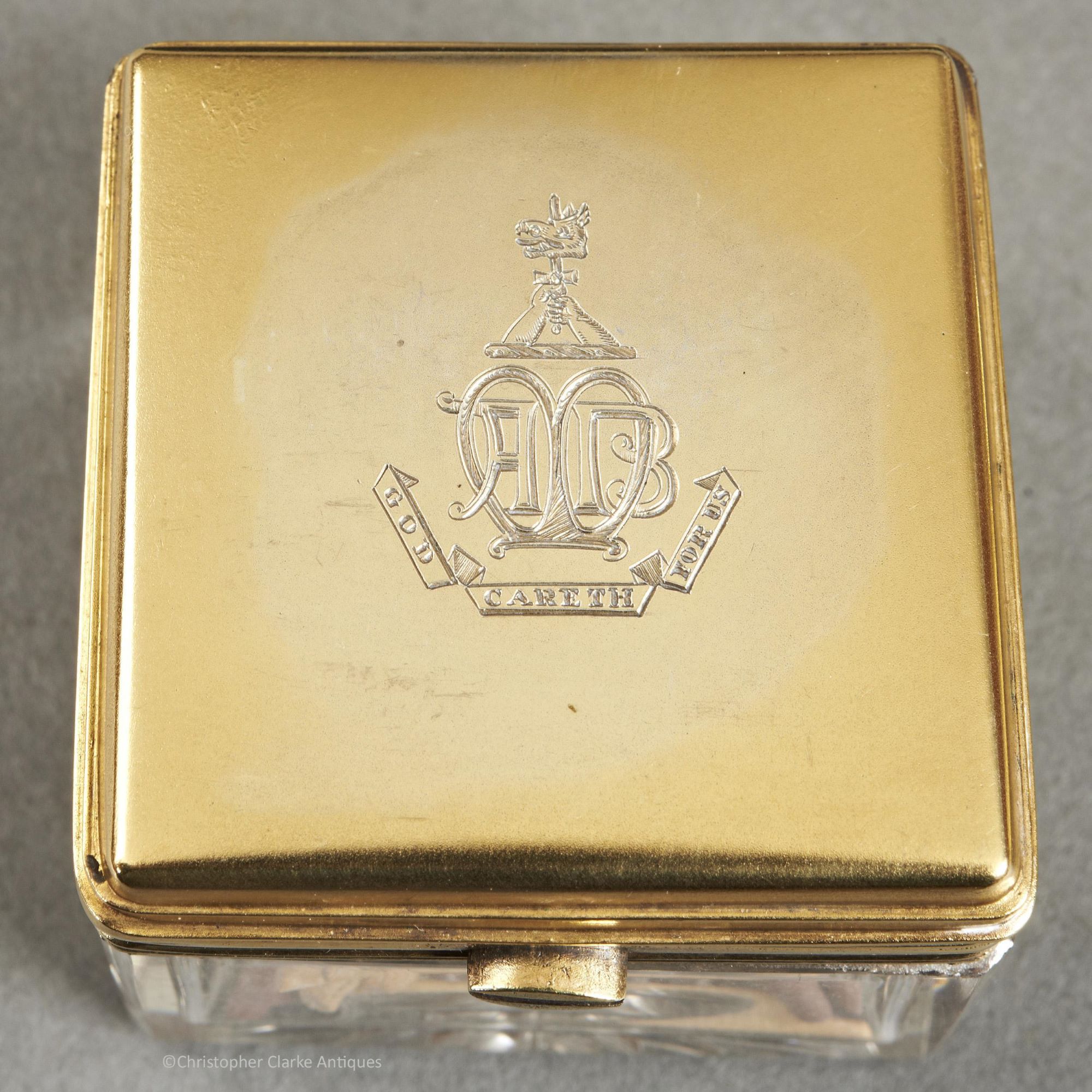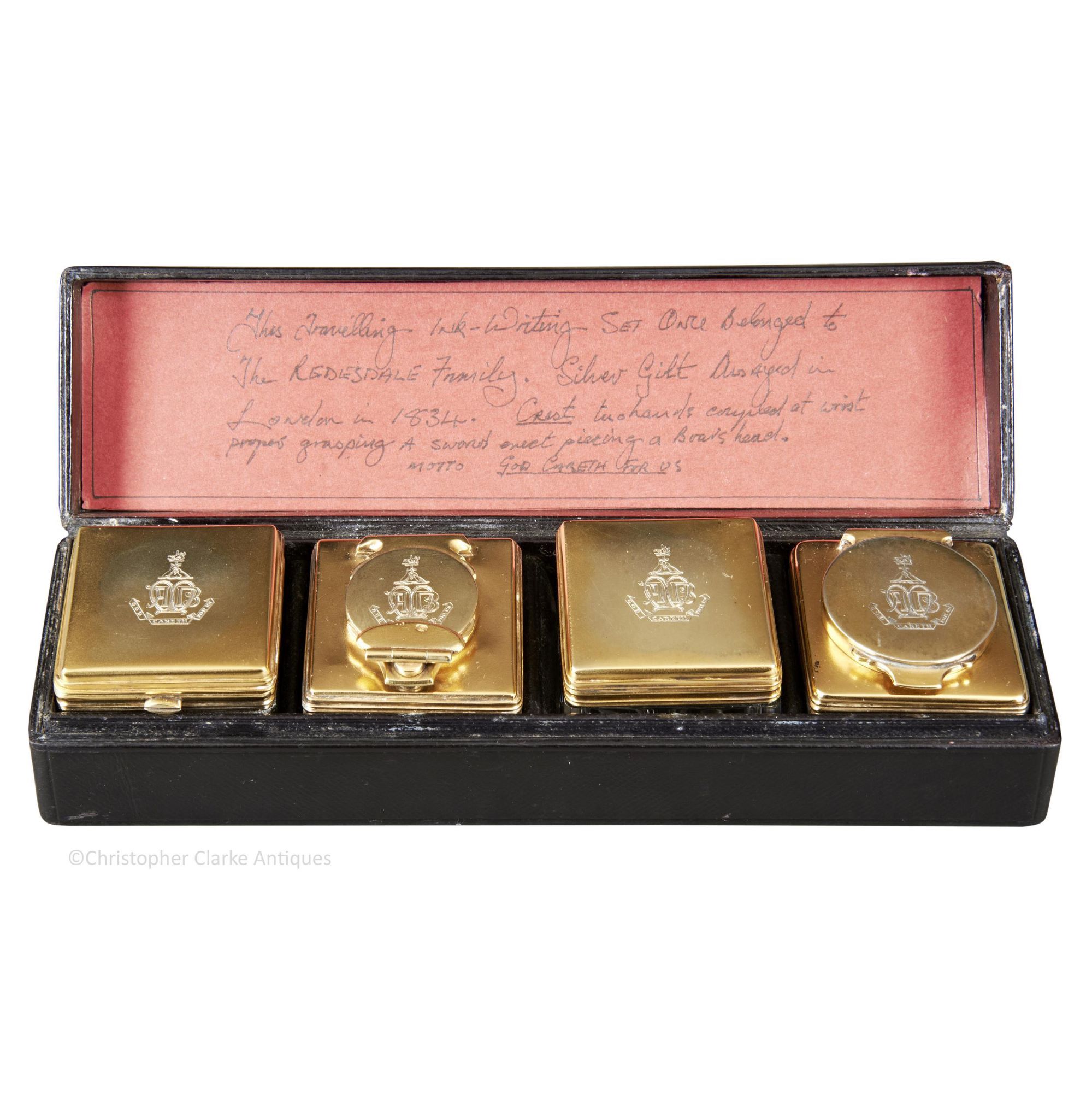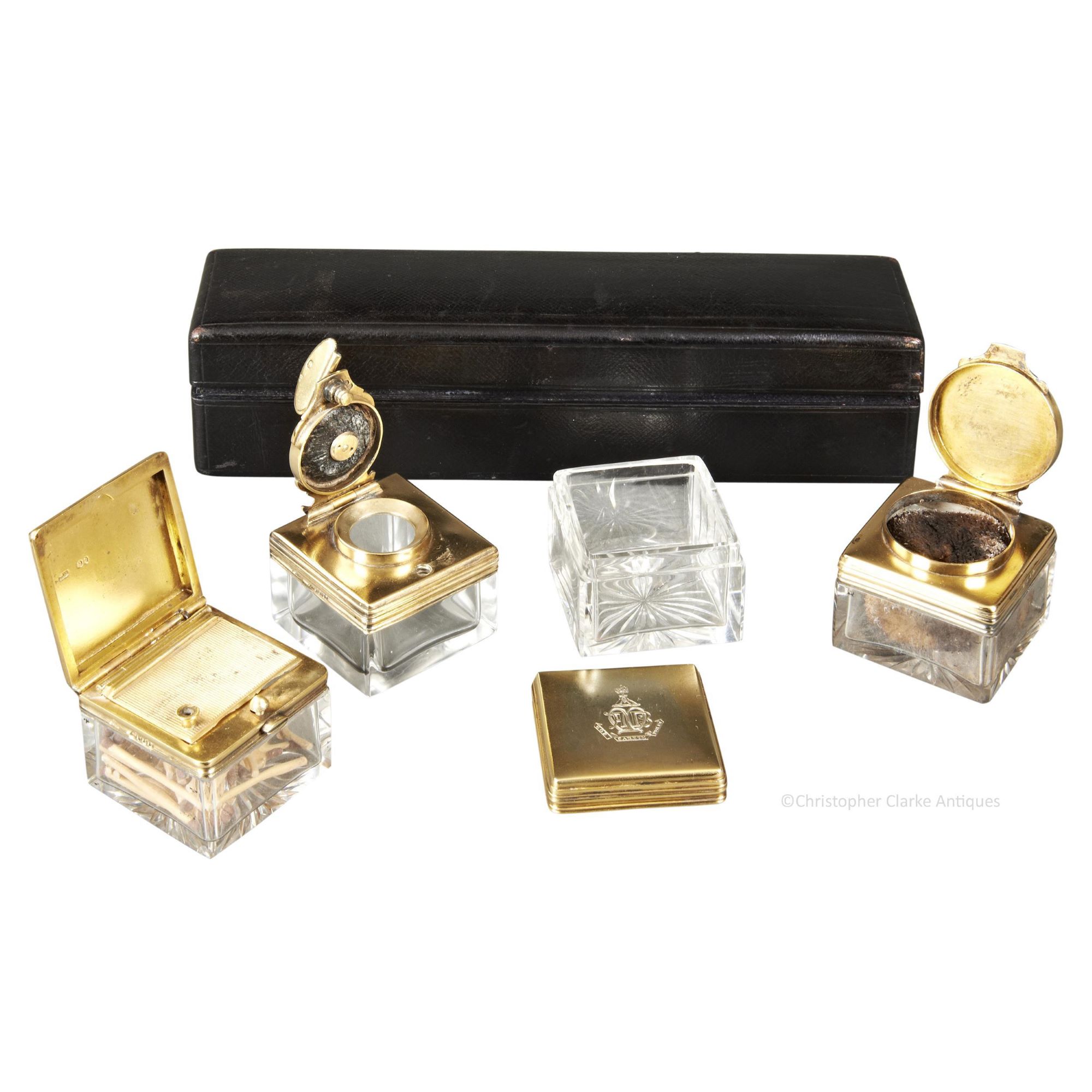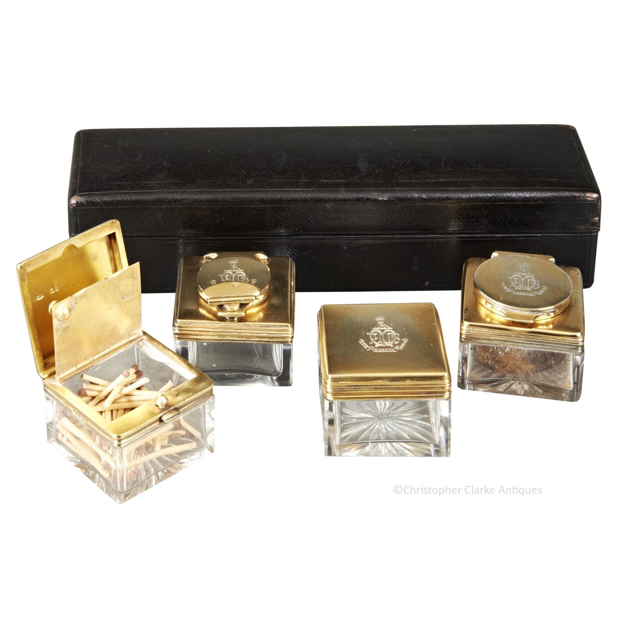 The four components of the set are a travel inkwell, a pen wipe with sponge, a plain jar with lid and a light box with matches. They are all engraved to the top with the Mitford coat of arms of two hands grasping a sword erect piercing a boar's head. Below are the entwined initials ABM and the motto 'God Careth For Us', for Algernon Bertram Mitford, 1st Baron Redesdale.
