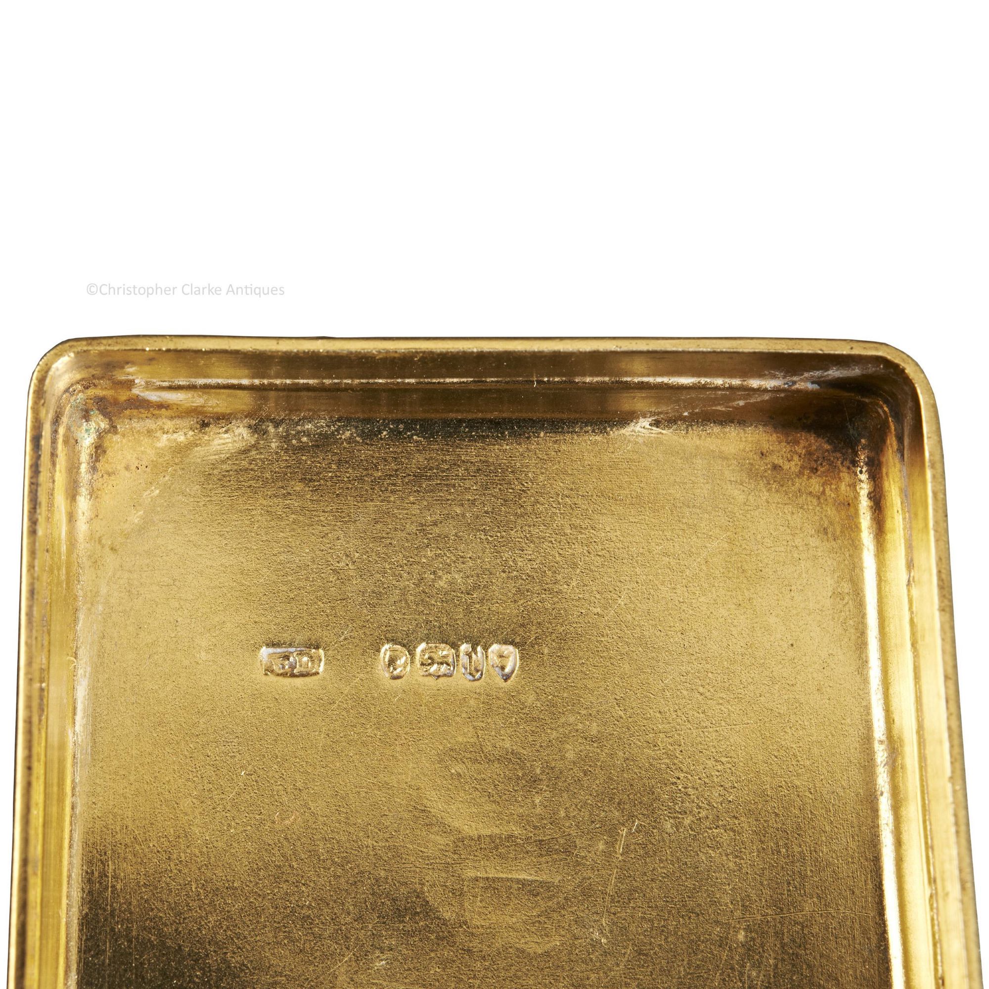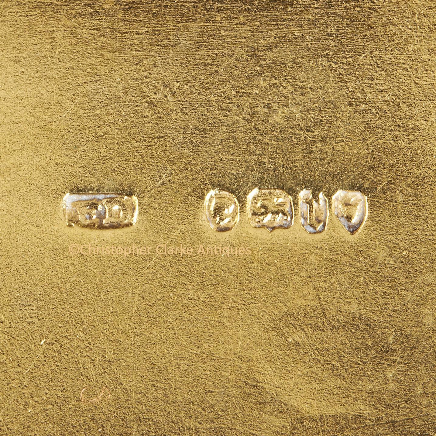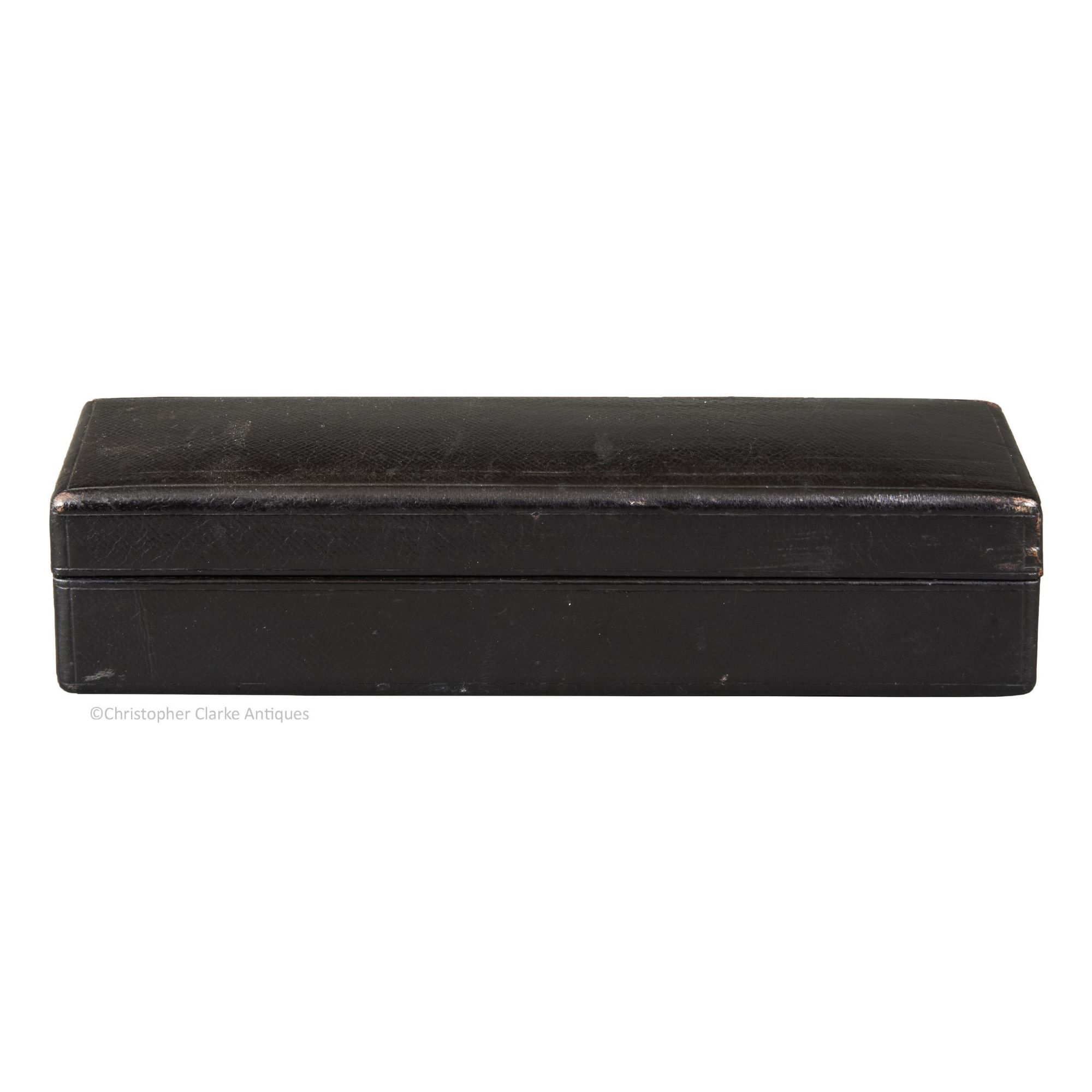 The curiosity to this set is that the London hallmarks for Frances Douglas for the different pieces have a variation in date of nearly 40 years. The pen wipe is dated 1836, which could also be true for the illegible marks to the inkwell, whereas the light box and jar are marked for 1874. An explanation may be that the two earlier parts were perhaps taken from a Portable Desk and added to later. The leather box that houses them was probably made in 1874.