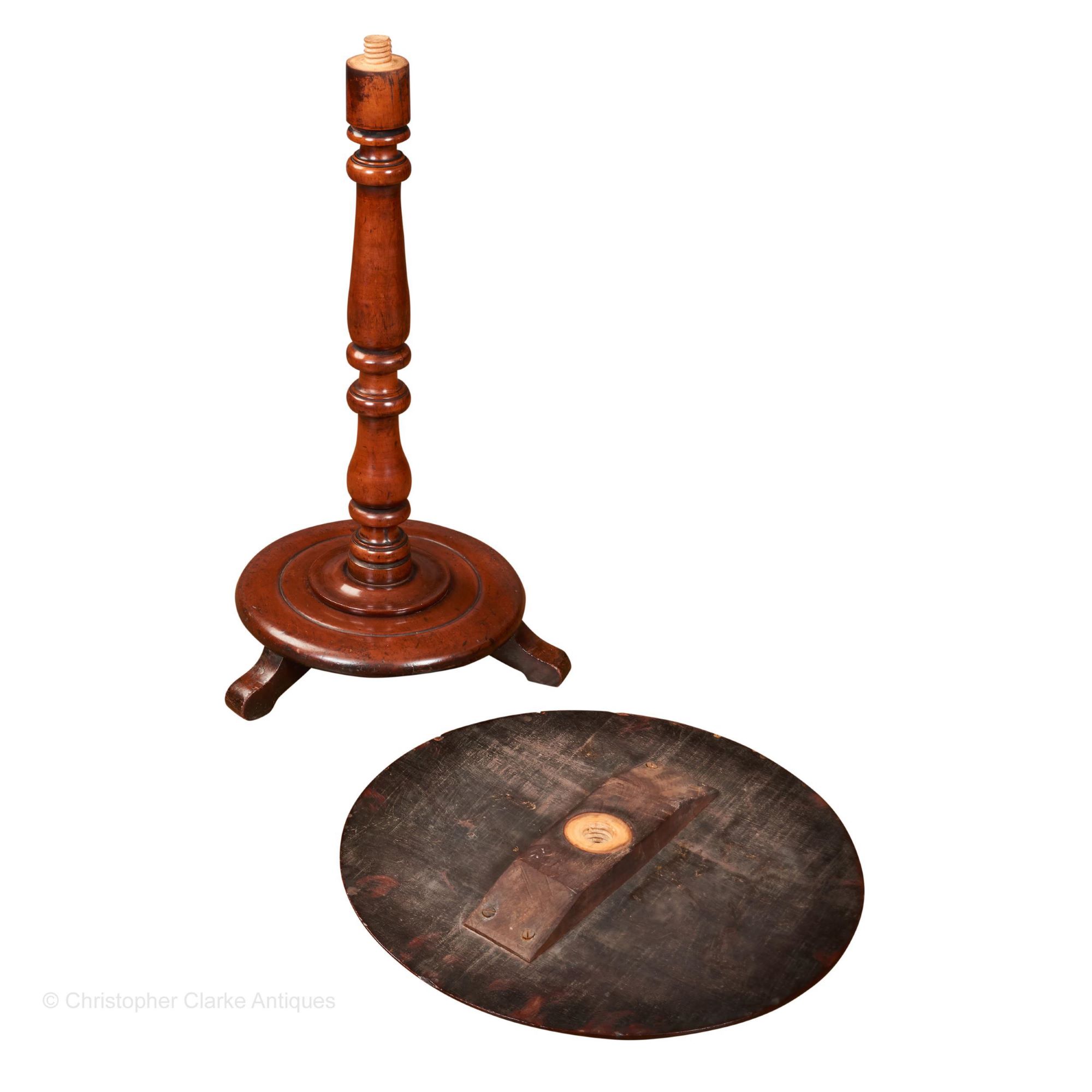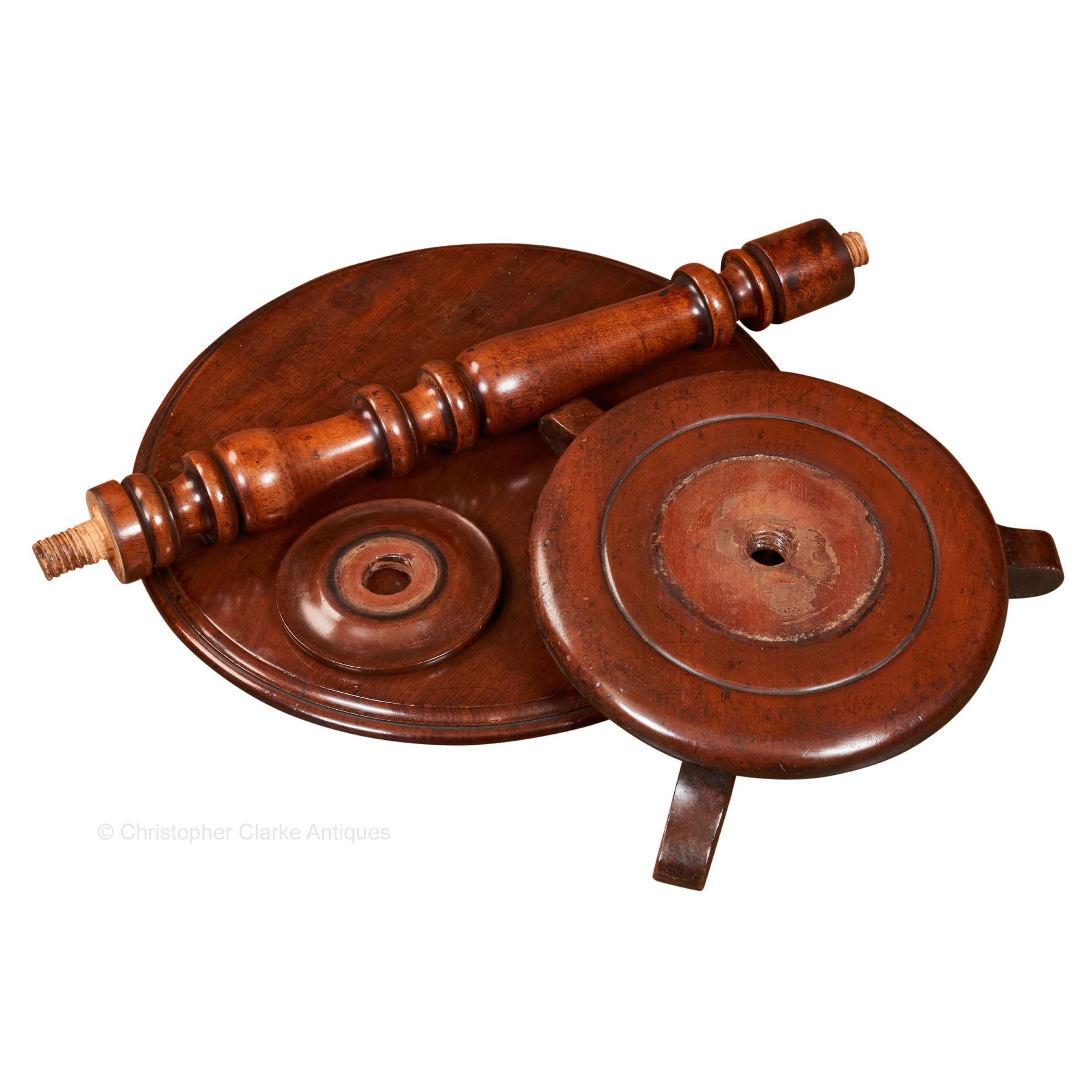 The table dismantles into 4 parts. The top has a bracing bar to its underside that has a threaded hole to receive the turned column. The column has a screw thread to either end and so fixes into the base. The fourth part is a turned collar that sits around the bottom of the column, where it meets the base, to give it a tidier finish. The base has three shaped feet to raise it off the ground.