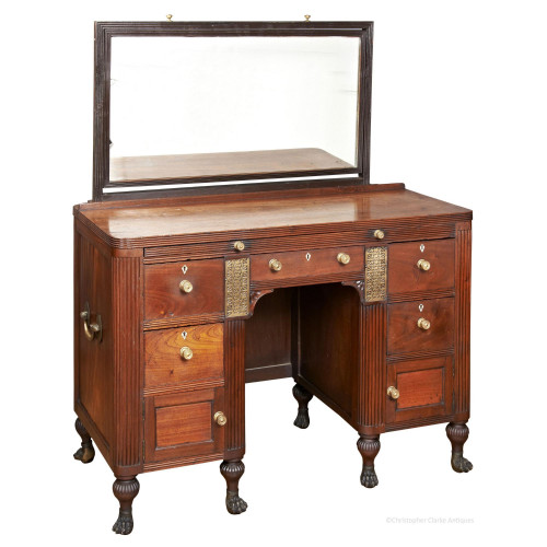 It has 3 graduated, full depth drawers with brass skeletal campaign handles and diamond escutcheons to the locks. The top has 2 fold down leaves which are supported by lopers when opened. The carcase has a panelled construction and stands on turned baluster feet. This would be useful piece of furniture on board ship, where cabins were typically small. Its dual purpose provides good storage and a decent sized top which could be used as a desk or to dine off. With the top open, it extends to 35 inches wide. Circa 1860.