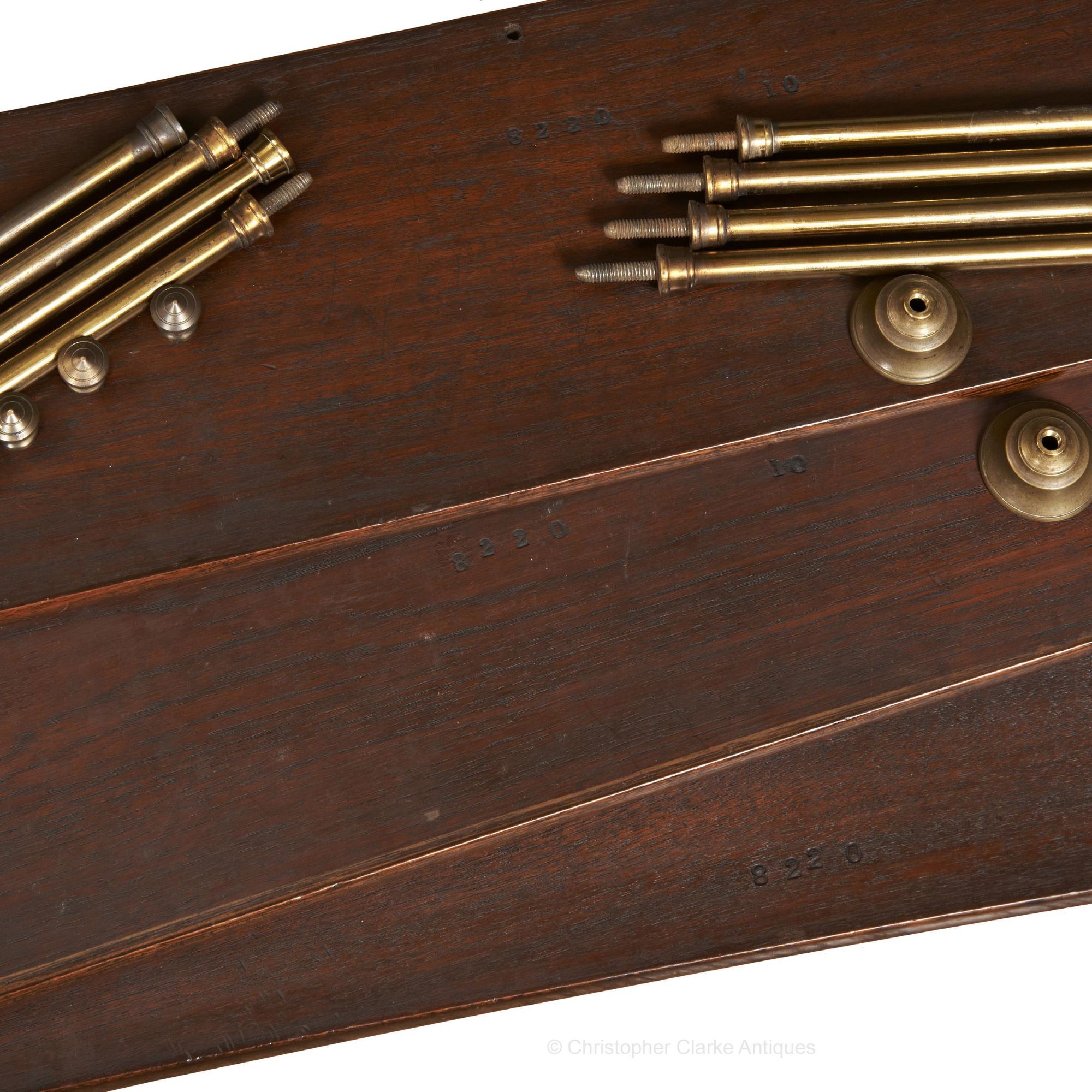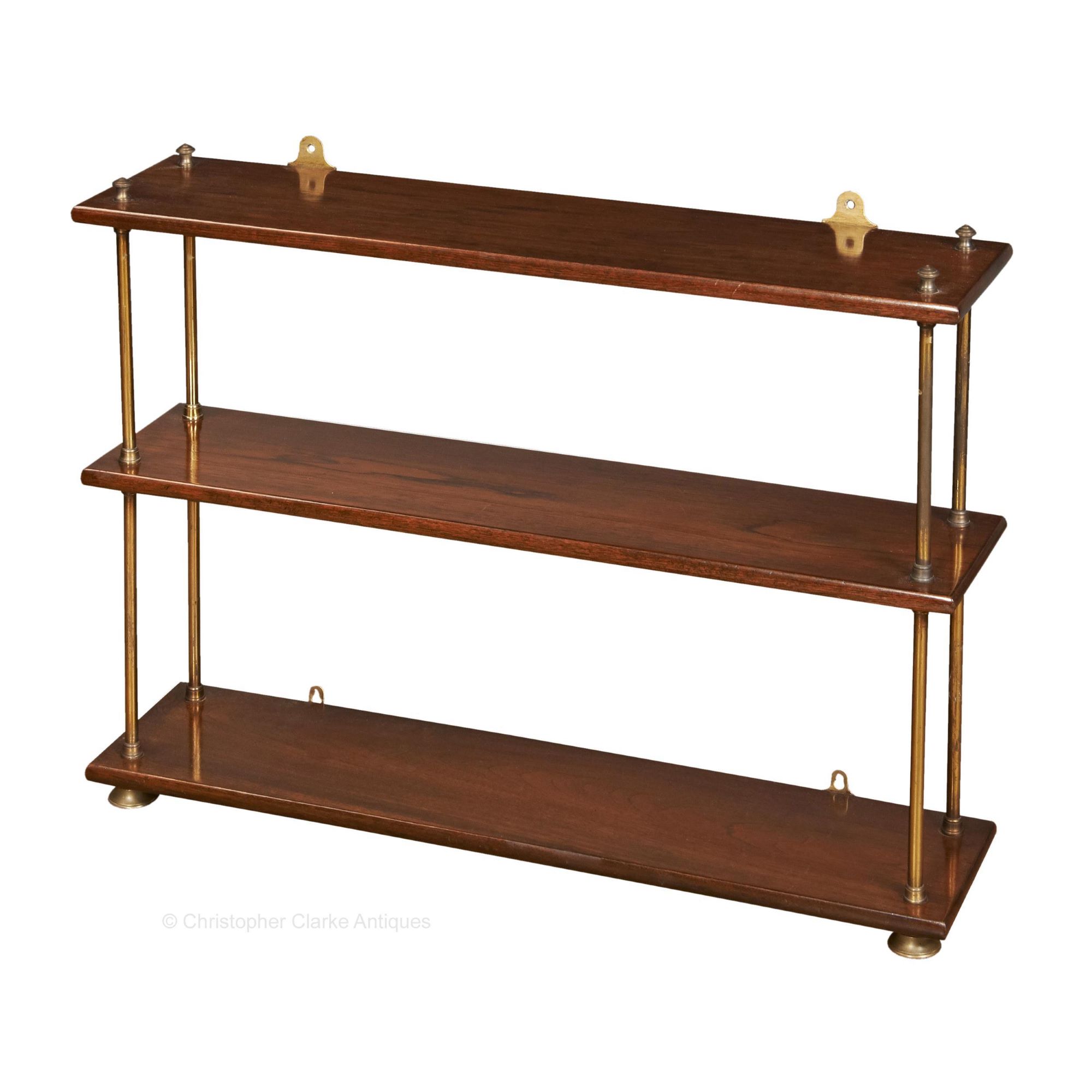 The teak has a dark colour to the grain which looks good against the brass standards that separate the shelves. To dismantle them for travel, the brass finials to the top shelf are unscrewed and removed. The top shelf can then be lifted off and the brass standards unscrewed from those below them. The bottom four standards are screwed into brass cup feet.