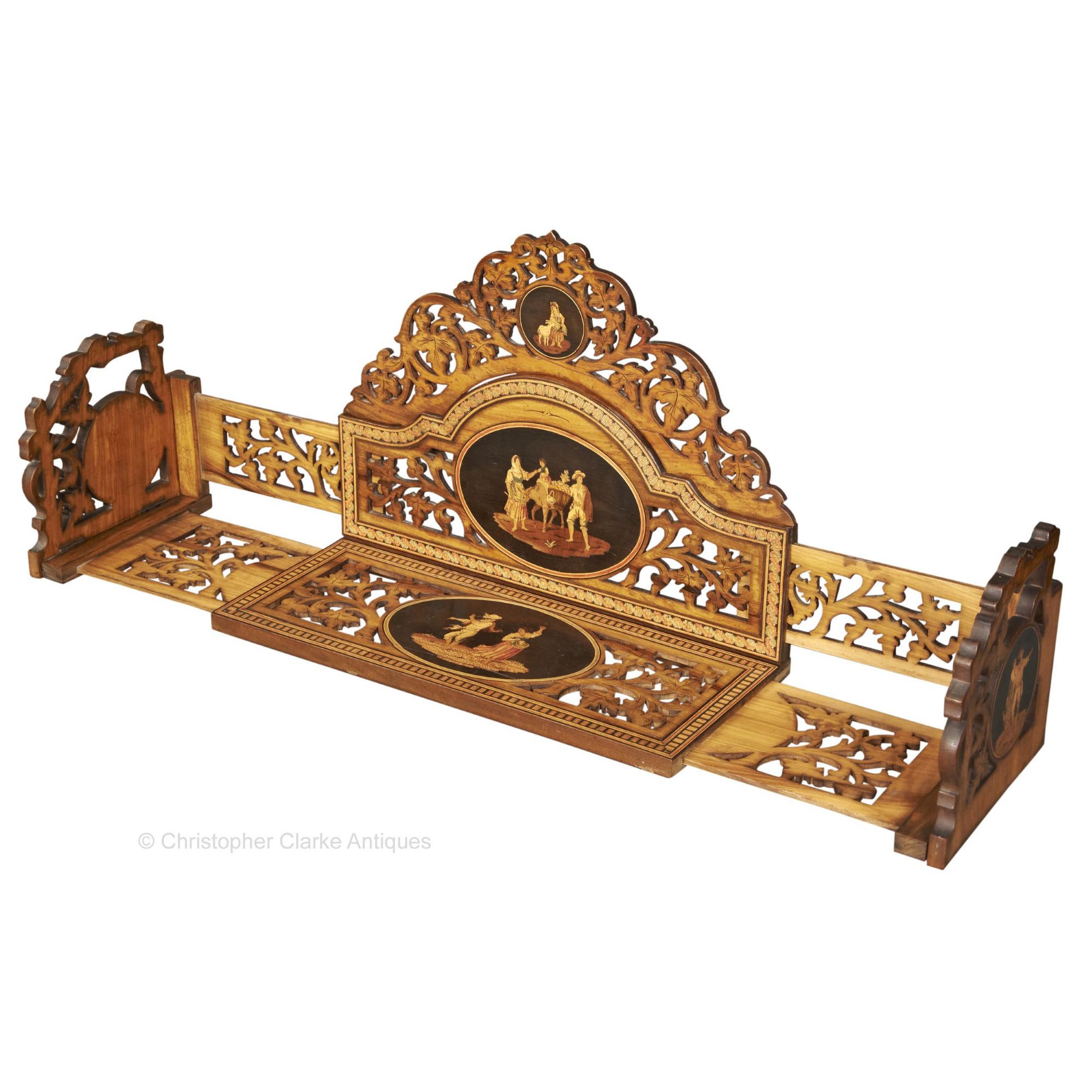 A Sorrento Ware walnut with various inlaid woods, fretwork Book Slide. The Book Slide extends in length and dismantles into three pieces to flat pack for travel. The arched cresting rail lifts off, and the back board also lifts up. It's held to the sides by long dovetails that slide into their counterparts to the inside back of the sides. The back board also has two locating lugs that drop into holes to the back of the base.