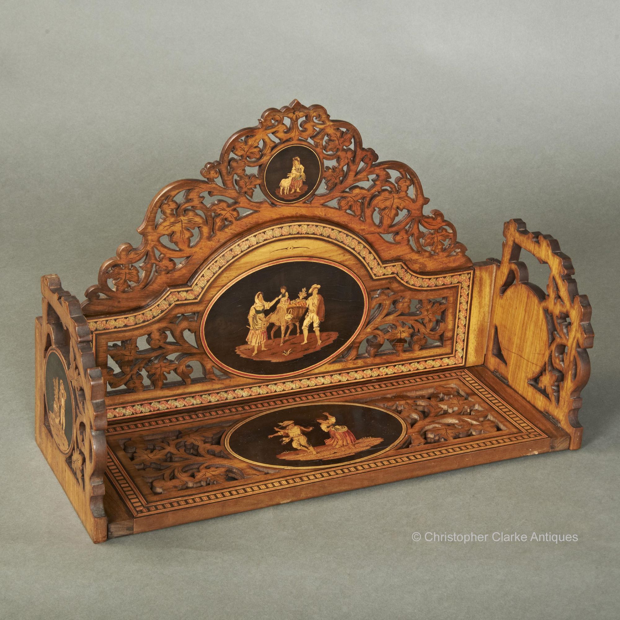 The fact that this Book Slide 'flat packs' so easily and is such a good example of Sorrento Ware means it would have had great appeal to the late 19th century tourists, the Italian town of Sorrento attracted. Mid to late 19th century.