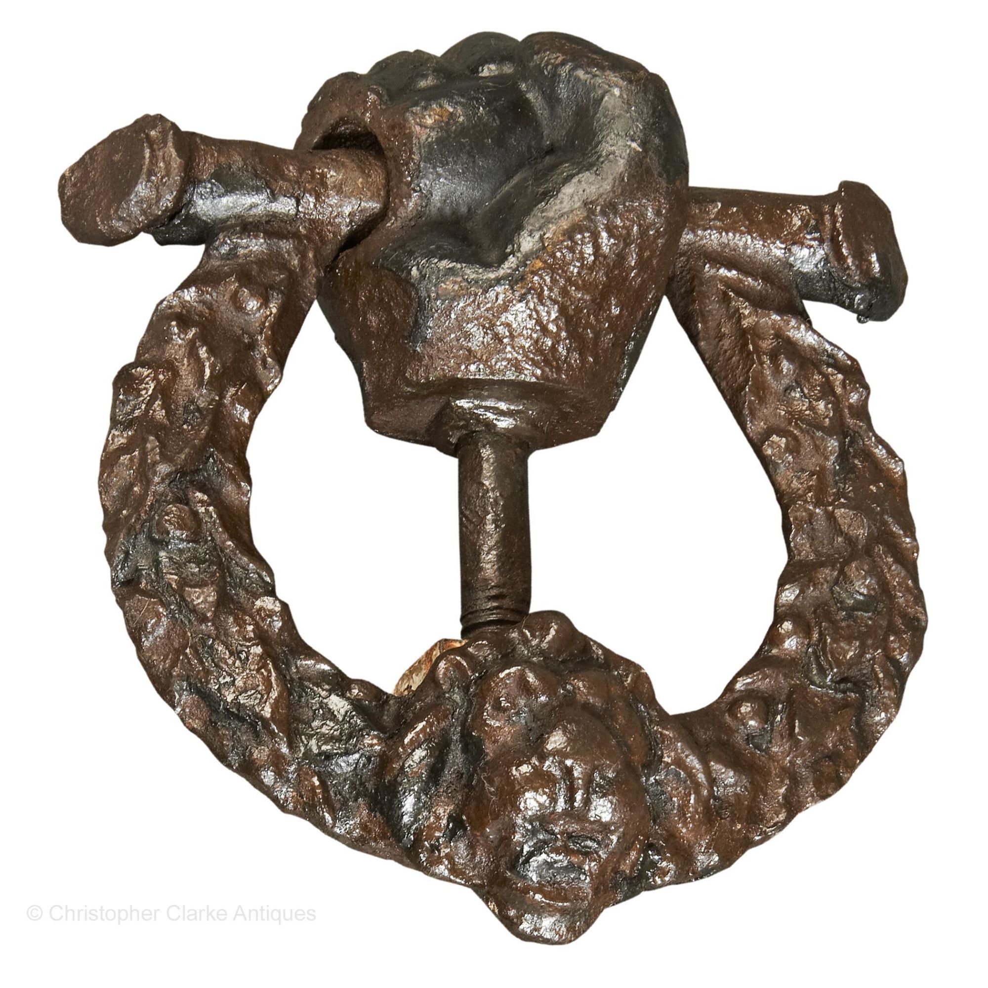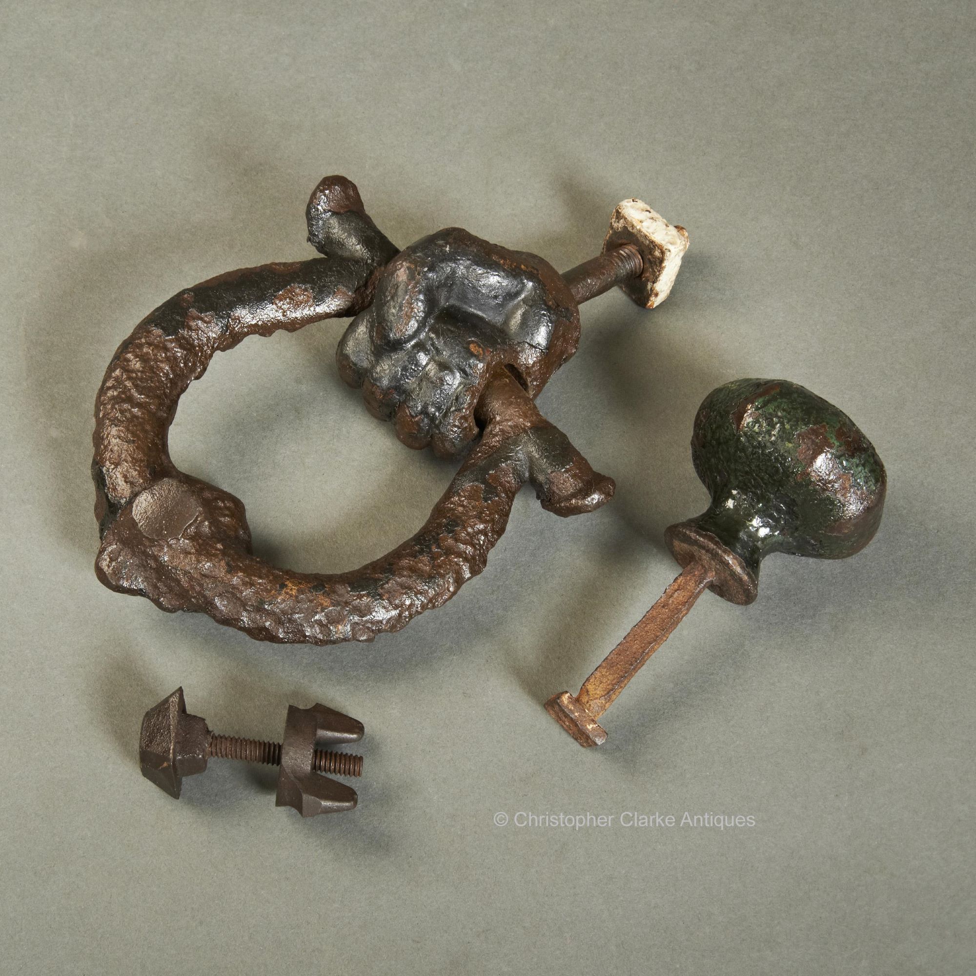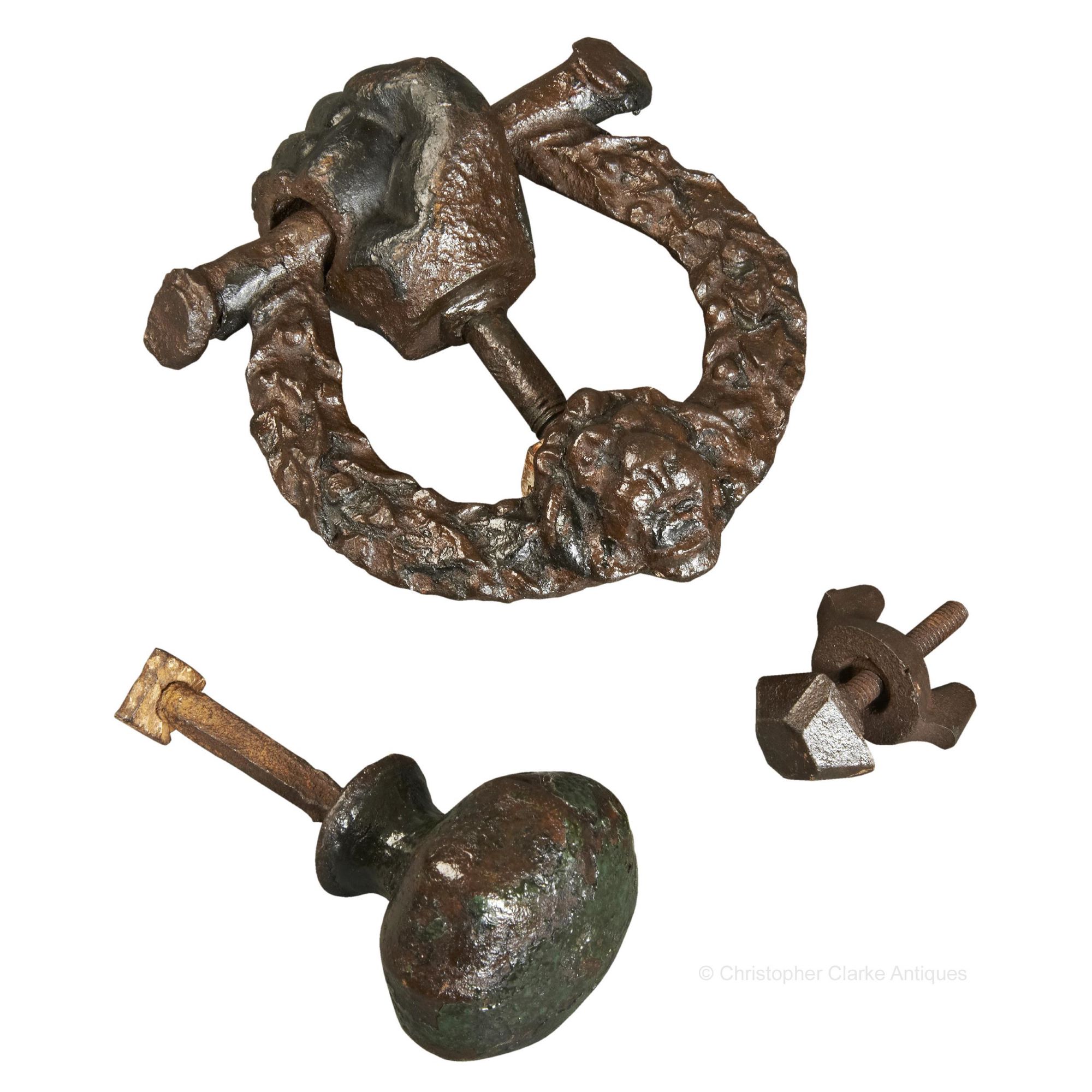 The knocker has some pitting to the iron and the remains of paint here and there. It comes with a door stud and a Gothic pattern door pull. Mid 19th Century.